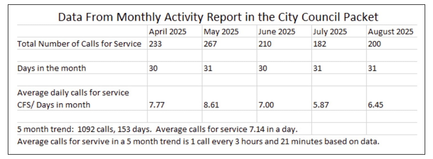 I’d implore you to look at actual DATA to make staffing decisions. The data you need to review is CALLS FOR SERVICE. Officers can stay busy with traffic stops, business checks, vacation watches, etc, but the calls for service should drive staffing. I did a quick dive into the data from the past 5 months of this data given to the council. The 5 month average is 7.14 calls per day. That is one call for service approximately every 3 hours and 21 minutes.